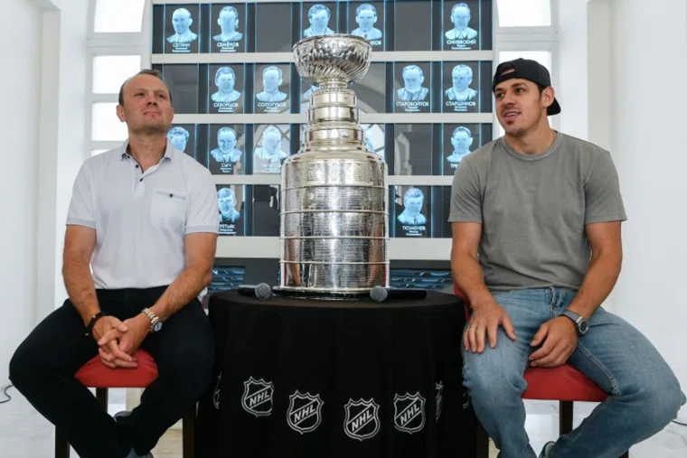 Тренер клуба НХЛ «Питтсбург Пингвинз» Сергей Гончар (слева) и хоккеист клуба НХЛ «Питтсбург Пингвинз» Евгений Малкин на презентации Кубка Стэнли в Москве