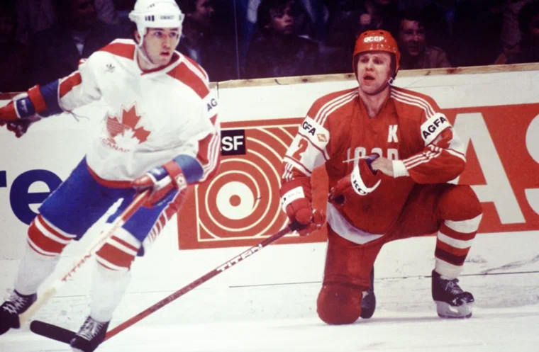 Вячеслав Фетисов (справа) во время матча со сборной командой Канады на чемпионате мира и Европы по хоккею с шайбой в 1985 году в Праге