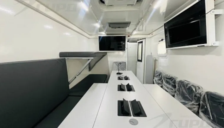 В командно-штабном отсеке автомобилестроители разместили большой рабочий стол со встроенными розетками, пять складных стульев и три больших монитора. Для длительных операций инженеры предусмотрели трансформирующиеся в спальные места диваны-рундуки и откидная спальная полка.