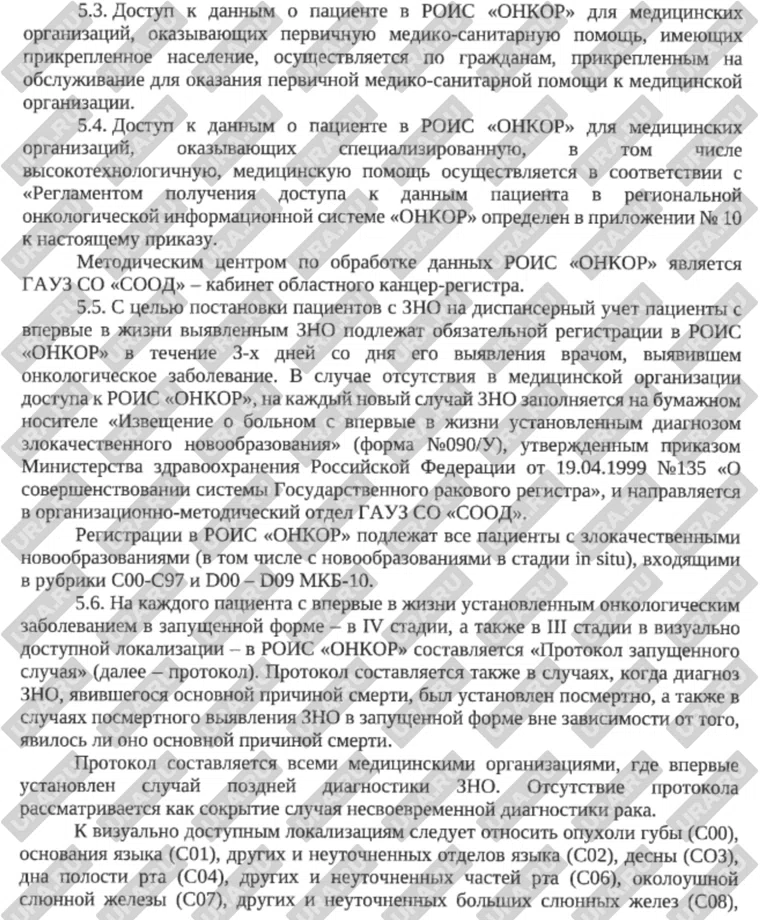 «На каждого пациента с впервые в жизни установленным онкологическим заболеванием в запущенной форме — в четвертой стадии, а также в третьей стадии в визуально доступной локализации — в региональной онкологической информационной системе (РОИС) „ОНКОР“ составляется протокол запущенного случая. Отсутствие протокола рассматривается как сокрытие случая несвоевременной диагностики рака», — говорится в документе (есть в распоряжении URA.RU).