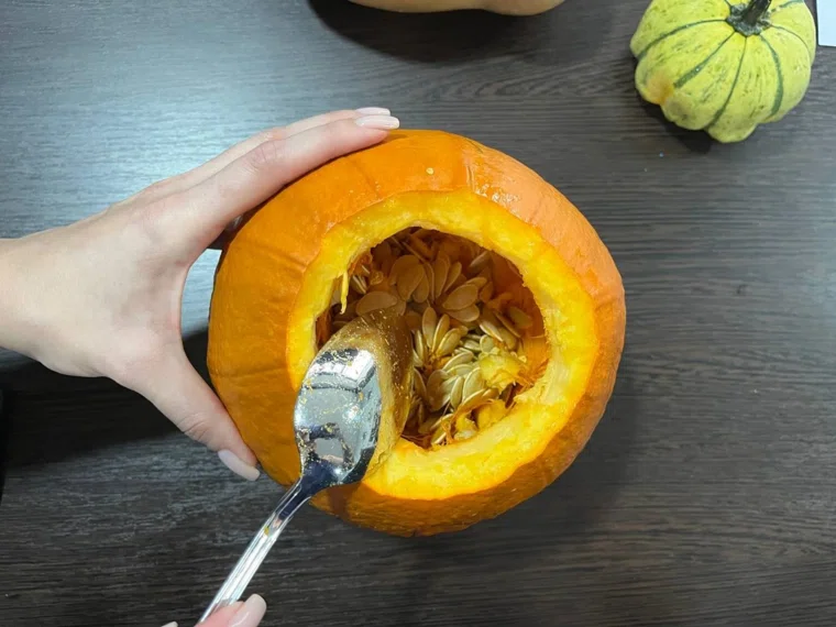Затем очистите тыкву от семян и волокон. Постарайтесь, чтобы внутренности из вашего будущего фонаря были максимально изъяты. С круглой, как говорилось ранее, проблем не возникло. А вот с грушевидной тыквой мы повозились.