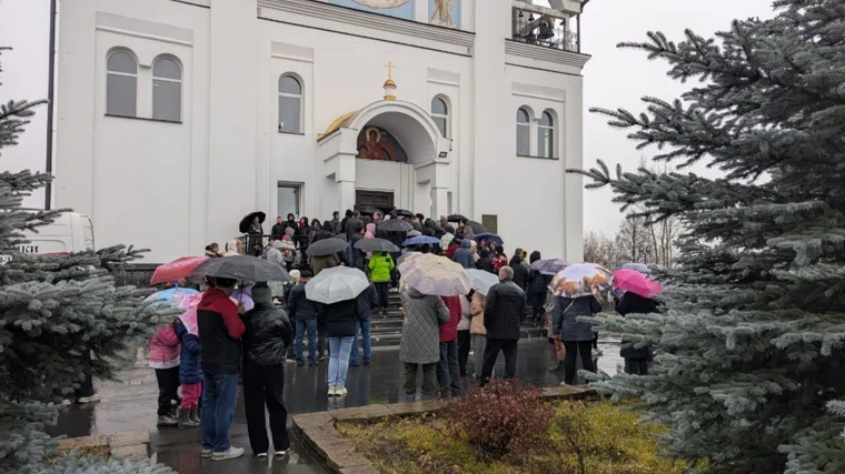 Возле храма дежурят медики. Горожане взяли с собой зонтики — в Ревде идет небольшой дождь.