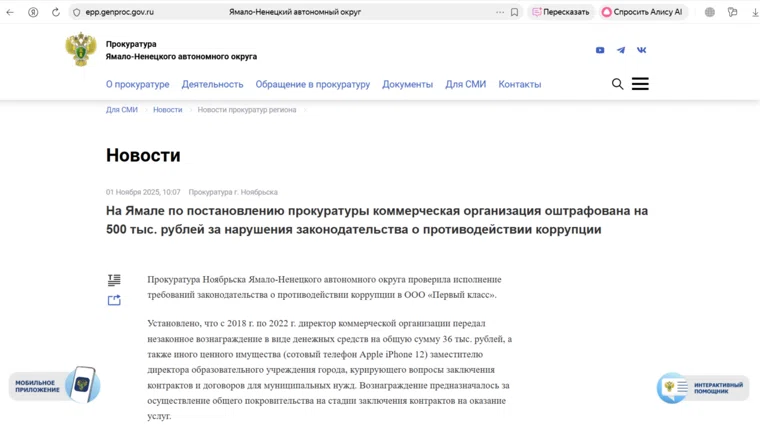 «Прокуратура Ноябрьска Ямало-Ненецкого автономного округа проверила исполнение требований законодательства о противодействии коррупции в ООО „Первый класс“... По результатам его рассмотрения организация оштрафована на 500 тыс. рублей, с конфискацией вознаграждения, также запрещена деятельность по участию в исполнении контрактов для государственных и муниципальных нужд», — написано на сайте ведомства.