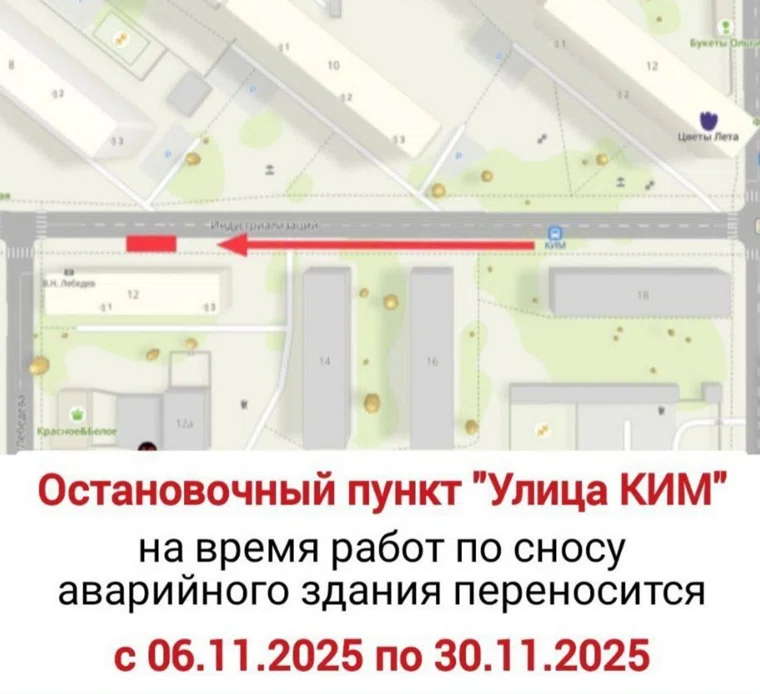 «Причиной переноса стало проведение работ по сносу аварийного здания, расположенного рядом с первоначальным местом остановки „Улица КИМ“. Временное расположение будет действовать до 30 ноября 2025 года», — указано в telegram-канале ведомства.
