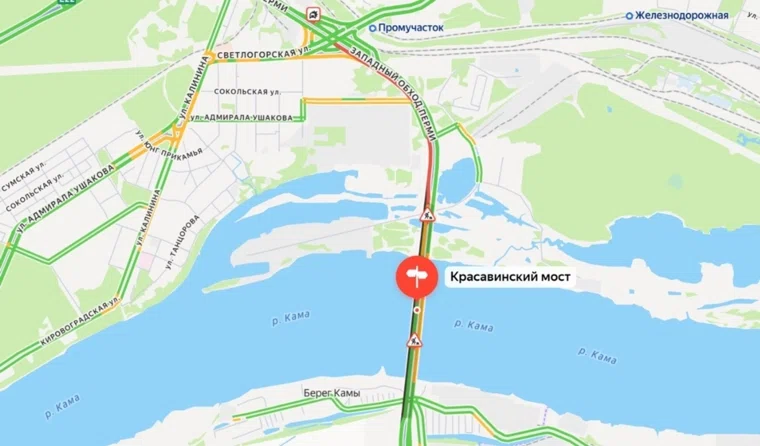 В Перми второй день подряд водители стоят в огромной пробке на Красавинском мосту. По данным сервиса Яндекс.Карты, затор растянулся на несколько километров.