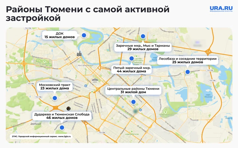 «Тюмень, ноябрь 2025 года. Активное строительство ведется во всех районах города. Наиболее активные работы ведутся в районе Тюменской слободы и Дударева. Здесь девелоперы возводят 46 жилых домов», — показывает анализ данных.