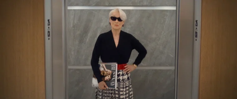 Миранда заходит в лифт, и в последний момент туда же забегает Энди Сакс в исполнении Энн Хэтэуэй. Бывшая робкая ассистентка теперь выглядит как уверенная бизнесвумен — стильный деловой костюм, элегантная прическа, никакой прежней скованности. Когда двери закрываются, между героинями повисает напряженное молчание. Миранда с характерной ледяной интонацией произносит: «Долго же тебя пришлось ждать». Энди в ответ лишь слегка ухмыляется и надевает черные солнцезащитные очки — жест, символизирующий, что она больше не та наивная девушка.