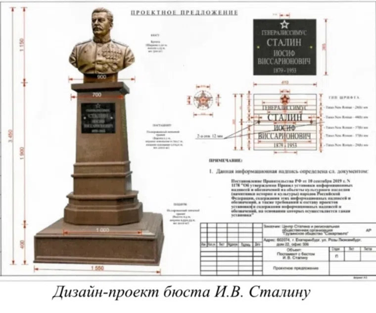 С инициативой установить бюст советскому вождю выступили региональное «Грузинское общество „Сакартвелло“», Центр Сталина и «Интернациональный союз диаспор». Памятник планировали возвести в районе бульвара по улице Культуры на Уралмаше или на площади перед «Домом офицеров».