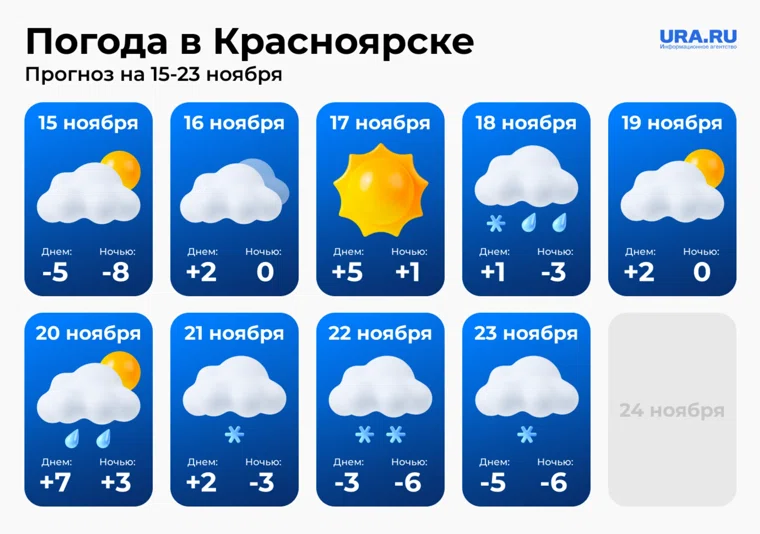 Конец рабочей недели в Красноярске ознаменуется похолоданием: в ночь с пятницы на субботу ожидаются самые низкие температуры этого месяца. Однако ближе к рабочей неделе ситуация изменится, и в городе потеплеет.
