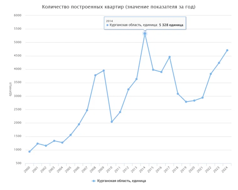 «За период с 2000 по 2024 годы в Курганской области построили 73 078 квартир. Максимальное количество было в 2014 году — 5328 квартир. Самый низкий показатель был в 2000 году — 935 квартир», — говорится в данных Росстата на сайте ЕМИСС.