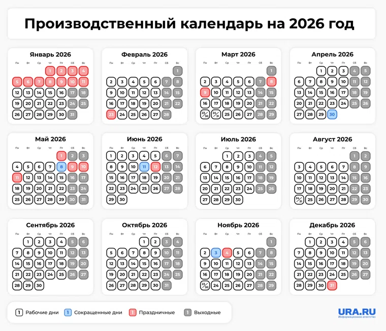 Правительство РФ утвердило производственный календарь на 2026 год. В следующем году россиян ждет 247 рабочих и 118 выходных и праздничных дней. Шестидневных рабочих недель не ожидается. URA.RU приводит полный производственный календарь на следующий год.