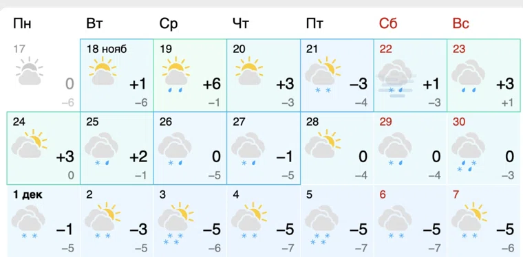 «С 17 по 30 ноября ожидаются перепады температуры, дожди со снегом, который быстро тает. С 17 по 23 ноября температура будет колебаться от положительных до слегка отрицательных значений. К концу месяца, с 24 по 30 ноября, станет чуть холоднее: до минус пяти ночью», — следует из прогноза метеорологов.