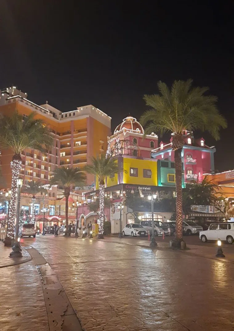 В самой южной точке Японии — Окинаве — мы остановились в городе под названием Чатан. Здесь же находится американская деревня — развлекательный комплекс с магазинами и ресторанами, где архитектура и атмосфера в стиле XX века гармонично сочетаются с окинавским колоритом. Несмотря на то, что мы путешествовали в конце октября, здания уже были украшены не только к Хэллоуину, но и к Рождеству. Множество огней, граффити с героями американских мультфильмов и пальмы, украшенные гирляндами — все это создает ощущение праздника и предоставляет лишний повод для фотографии.