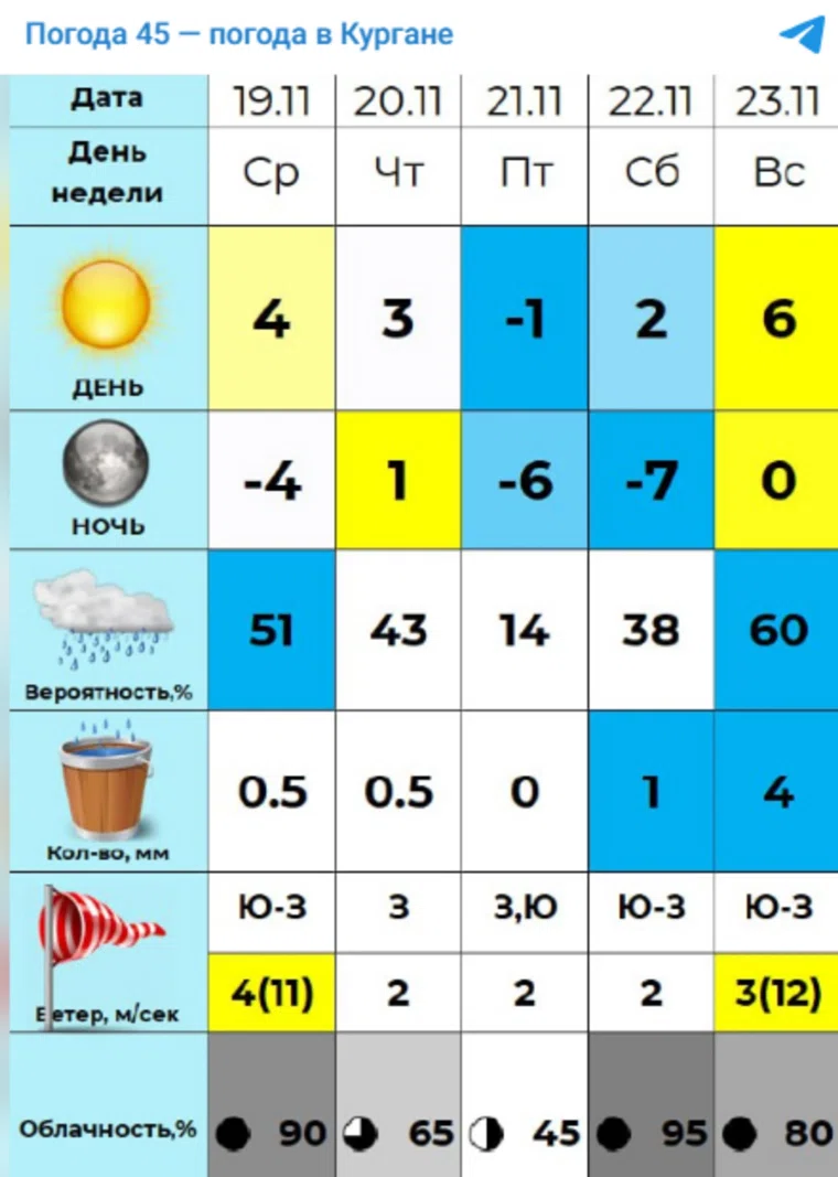 В Курганской области ожидается необычно теплая для середины ноября погода. В ближайшие две недели, с 18 по 30 ноября, дневная температура воздуха в Кургане будет колебаться от -1 до +6 градусов, а ночная — от +1 до -7 градусов. Об этом сообщает telegram-канала «Погода 45».