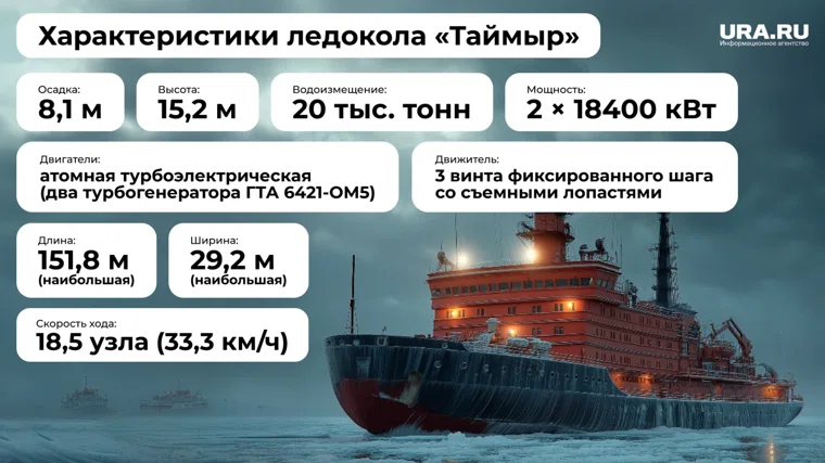 «Таймыр», относящийся к одноименному типу атомных ледоколов, был построен в конце 80-х в Финляндии, однако силовая установка советского производства устанавливалась уже в Ленинграде. Введен в эксплуатацию в 1989 году. За счет мощности в 50 тысяч лошадиных сил «Таймыр» ломает лед толщиной до 1,77 метра при скорости два узла.