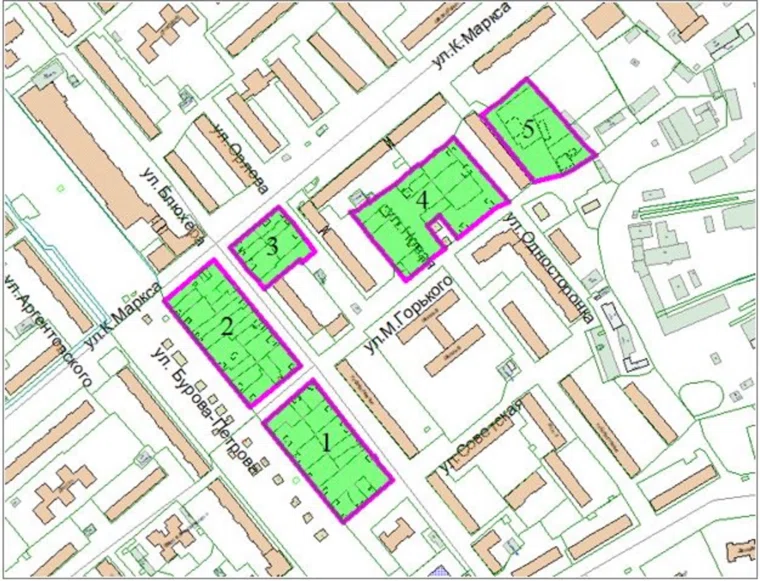 Участок под КРТ в границах улиц Бурова-Петрова, Советская, Василия Блюхера, Максима Горького, Односторонка, Карла Маркса в Кургане