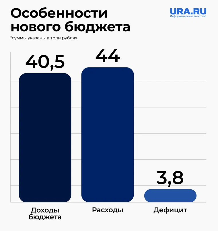 Доходная часть бюджета на плановый период запланирована в объеме 40,3 триллиона рублей, а расходная — 44 триллиона рублей. Дефицит бюджета составит 3,8 триллиона рублей.