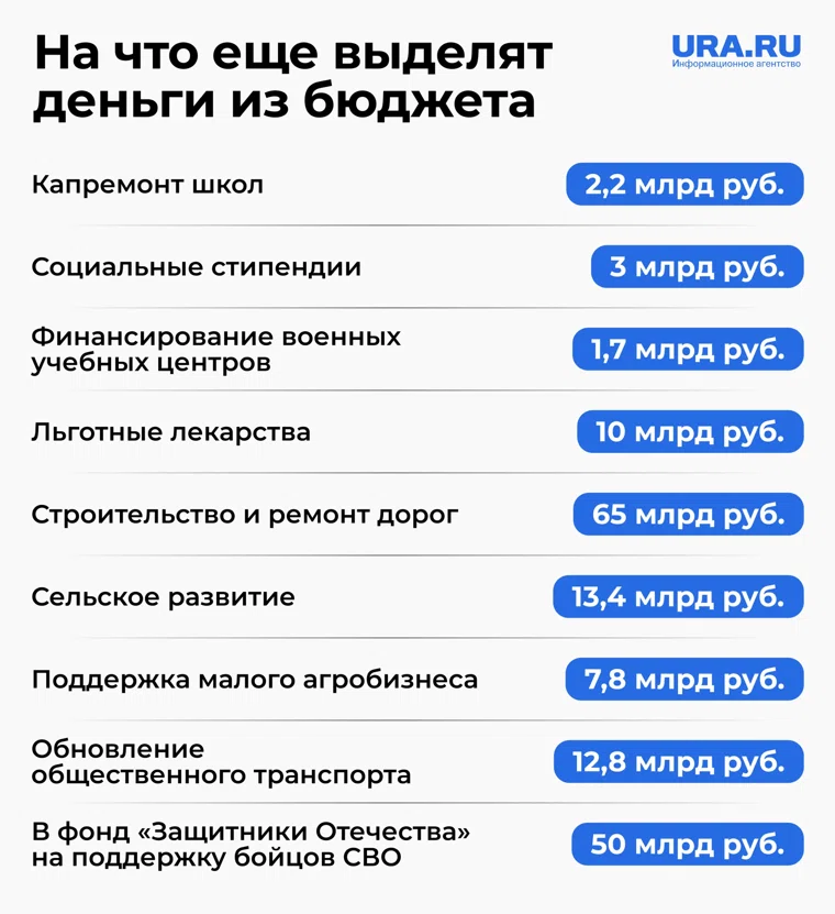 Отдельные проекты будут дополнительно профинансированы в 2026 году. Среди них: капитальный ремонт школ (2,2 млрд рублей), социальные стипендии для студентов (3 млрд рублей), обеспечение льготными лекарствами (10 млрд рублей), а также масштабное обновление дорожной инфраструктуры (65 млрд рублей на ремонт региональных и местных дорог). Отдельное внимание уделено развитию сельских территорий, включая комплексное развитие села, поддержку малого агробизнеса, обновление общественного транспорта и социальную газификацию.