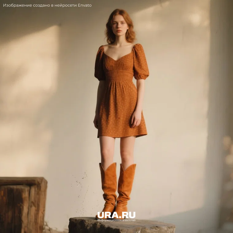 4. Рыжее платье + рыжие сапоги. Монохромный рыжий комплект с платьем и сапогами делает образ гармоничным и теплым, особенно для холодного сезона. Сумка или аксессуары в нейтральных оттенках (коричневый, бежевый) удерживают баланс и не перегружают образ.