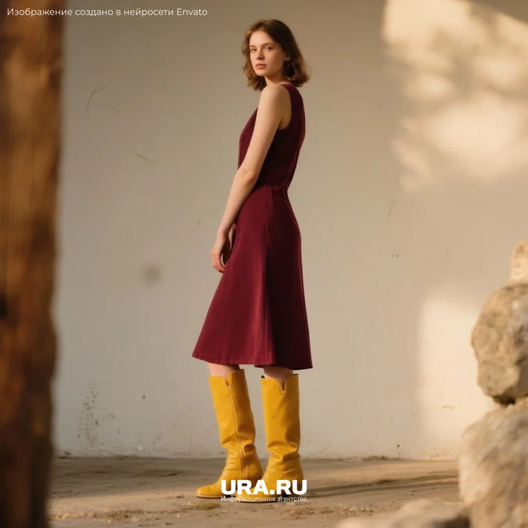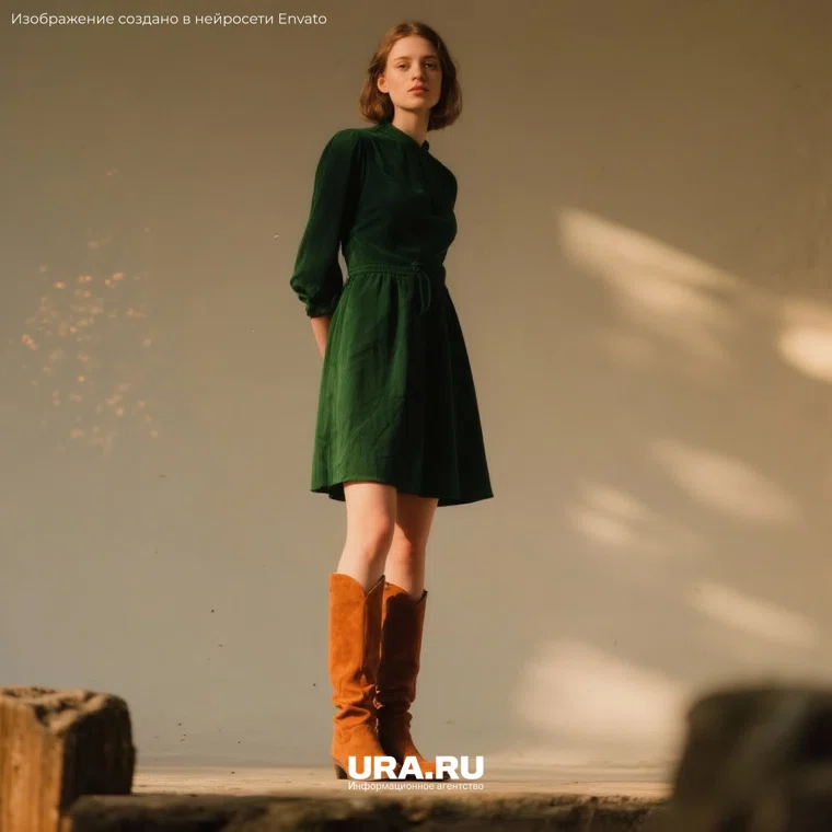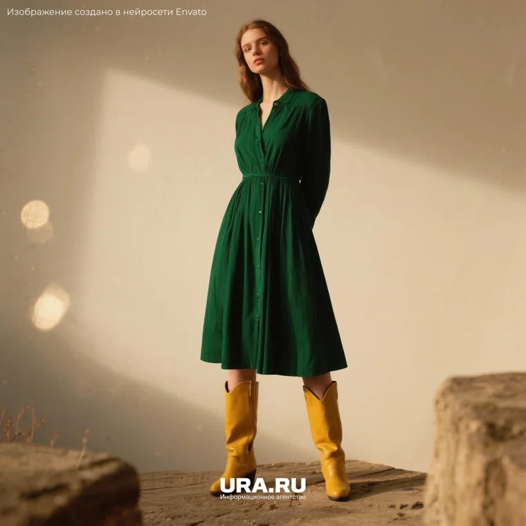 5. Горчичные сапоги + зеленый или бордовый комплект. Зеленое или бордовое платье в сочетании с яркими горчичными сапогами создает смелый и выразительный лук. Дополнительные акценты — шапка, шарф или ремень — подбираются в нейтральной гамме, чтобы подчеркнуть элегантность и практичность.