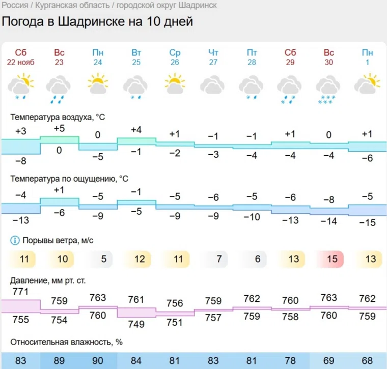 «Дожди в Кургане и Шадринске прогнозируются в это воскресенье, 23 ноября. Небольшой дождь возможен во вторник. К следующим выходным вероятны осадки в виде снега и мокрого снега, особенно сильный снегопад ожидается в воскресенье, 30 ноября», — указано в прогнозе Gismeteo.