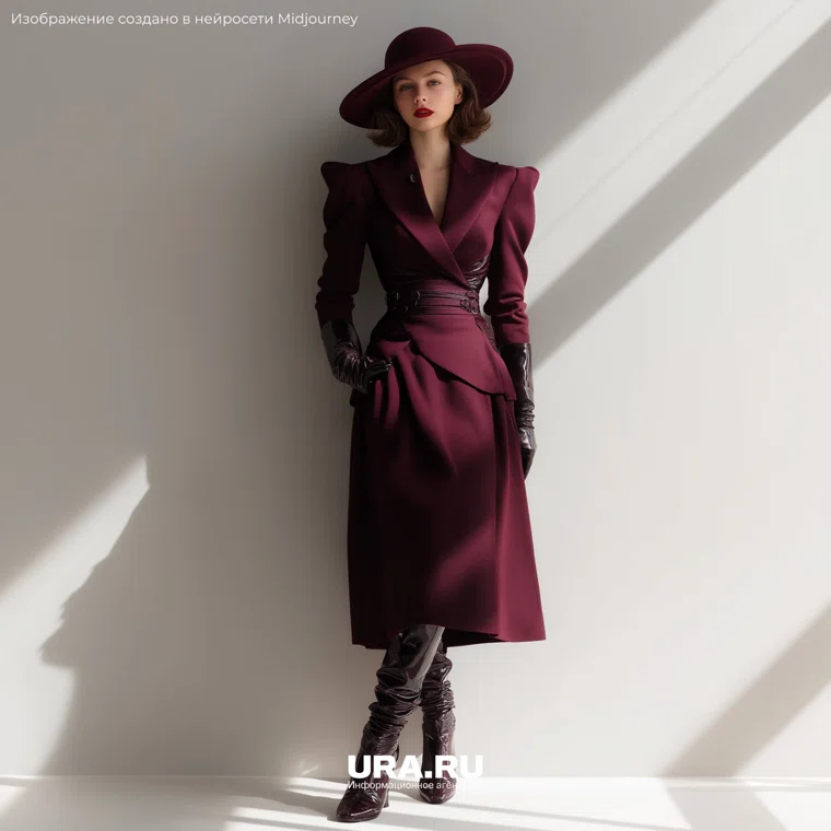 Бордовое приталенное пальто с выразительными плечами. Под ним — платье-миди из плотного шелка и лакированные сапоги-ботфорты. Дополнение — длинные кожаные перчатки и стильная шляпа.