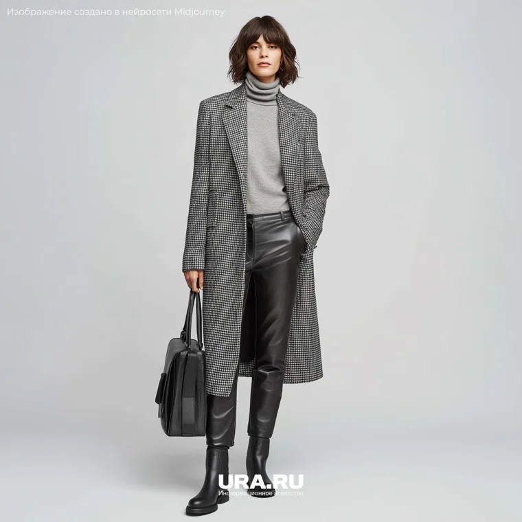 Приталенное пальто серого цвета в гусиную лапку, длина чуть ниже колена. Под ним — тонкий свитер-водолазка и прямые кожаные брюки. Завершают образ сапоги-челси и минималистичная кожаная сумка. Образ строгий, но женственный.