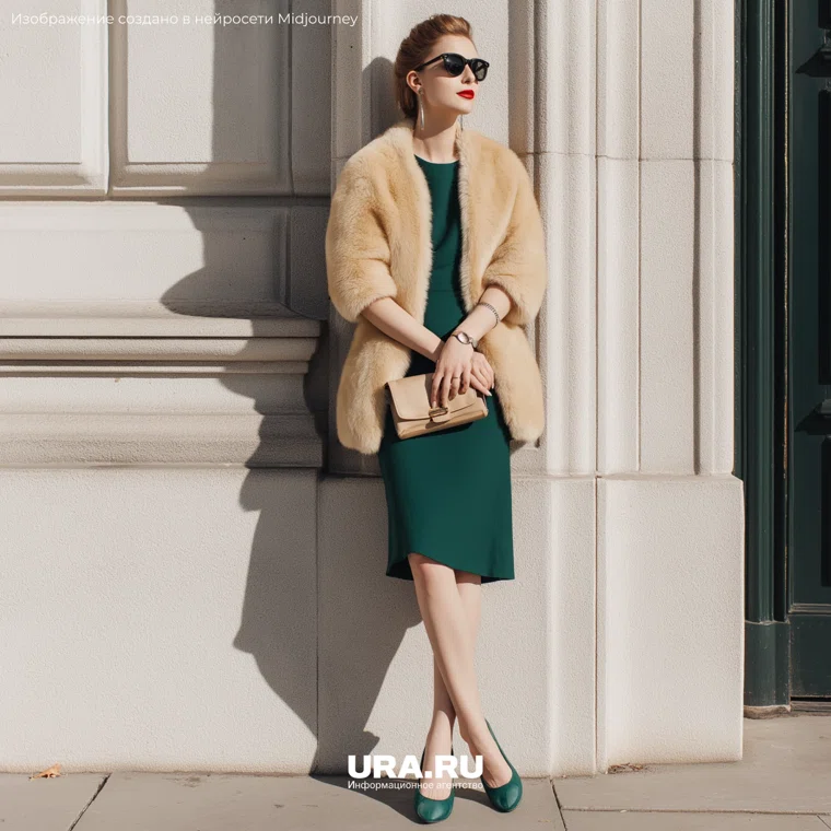 Укороченная шубка в стиле 50-х с рукавом реглан песочного цвета. Надевается с платьем-футляром темно-зеленого цвета и лакированными туфлями-лодочками. Элегантная сумочка-клатч дополняет образ.