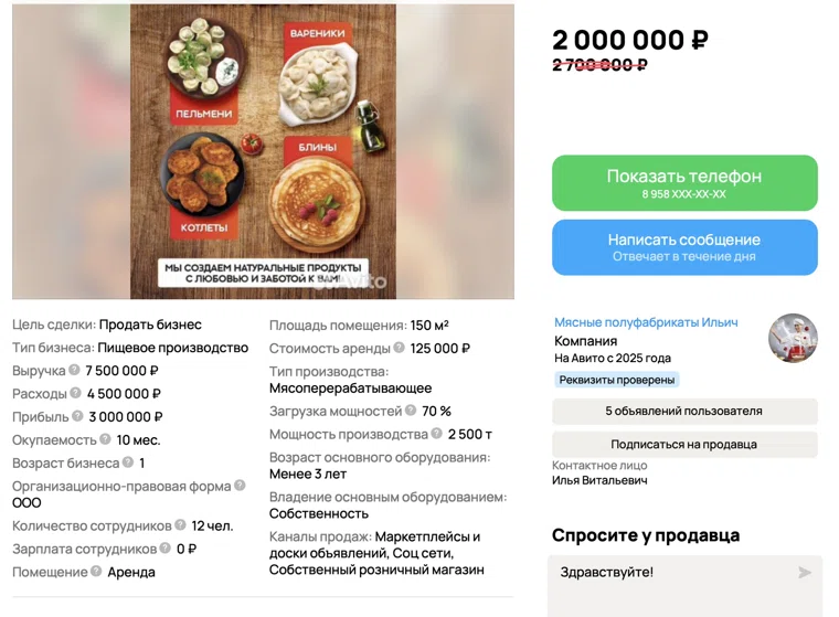 Фото: скрин сайта «Авито», https://www.avito.ru/chelyabinsk/gotoviy_biznes/prodam_gotovyy_biznes_myasnyh_polufabrikatov_ilich_7746249315