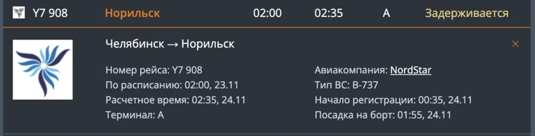 «Рейс Y7 908 Челябинск — Норильск. По расписанию: 23.11 в 02:00. Расчетное время: 24.11 в 02:35», — следует из данных онлайн-табло.