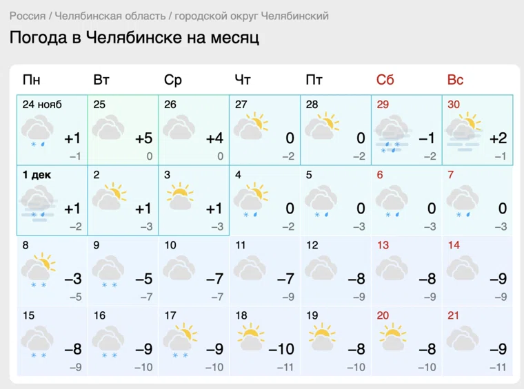 Сервис «Яндекс Погода» подтверждает прогноз коллег. В соответствии с опубликованными на сайте данными, осадки будут идти всего шесть дней из периода с 24 ноября по 23 декабря.