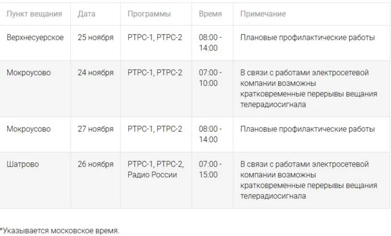 «С 24 по 30 ноября возможны кратковременные перерывы трансляции телерадиосигнала радиотелевизионными передающими станциями. В это время на станциях будут проводиться профилактические или другие плановые работы, требующие отключения передающего оборудования», — предупредили на сайте РТРС.