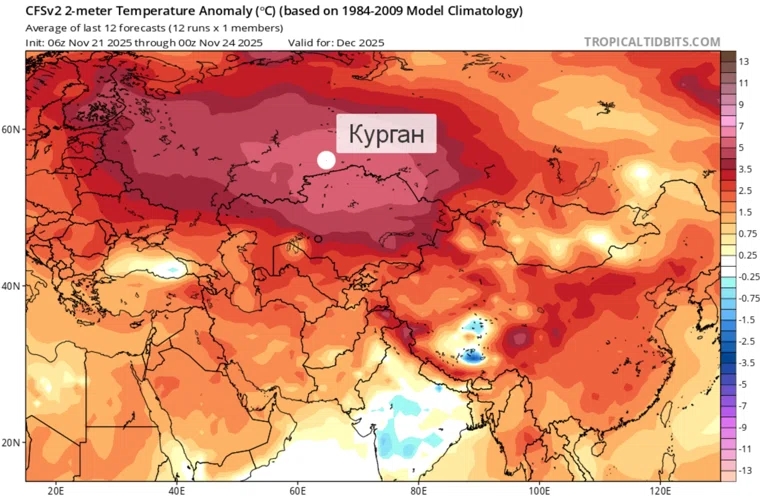 «Примерно так выглядит предварительный прогноз на декабрь: огромное, жирное красное пятно прямо над севером Казахстана и Курганской областью. Если этот прогноз реализуется, то декабрь будет не просто теплым, а очень теплым», — пишет telegram-канал «Погода 45».