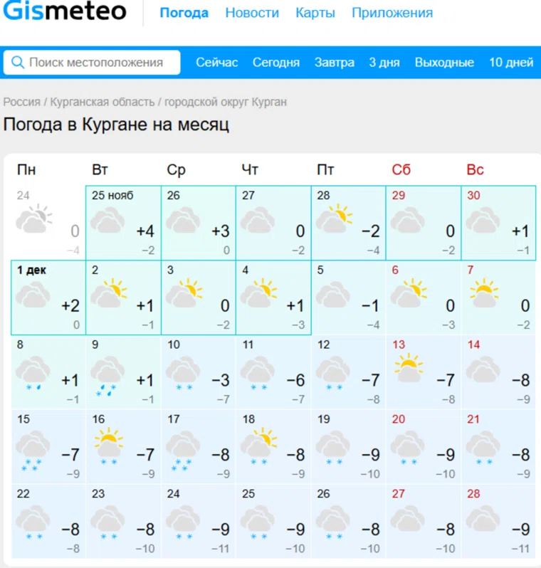 Когда в Кургане выпадет снег: прогноз на декабрь. Скрин