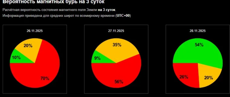 После повышенной геомагнитной активности 26 ноября магнитосфера Земли продолжит оставаться неспокойной. Для метеочувствительных людей период с 27 по 28 ноября станет временем особого внимания к здоровью — ожидается возбужденная магнитосфера с индексом 4 балла (оранжевый уровень опасности).