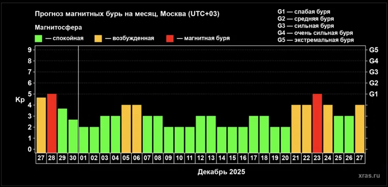 После 5-6 декабря спокойная геомагнитная обстановка ожидается до конца месяца. Лишь ближе к праздникам, начиная с 21 числа, магнитосфера вновь войдет в возбужденный режим. Пик геомагнитной активности придется на 23 число — в это время ожидается небольшой шторм.