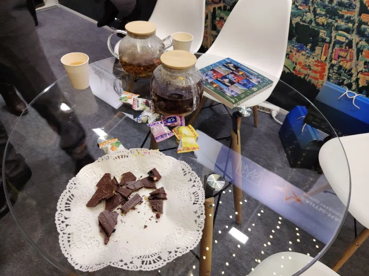 11:48 Съедобный малахит представил екатеринбургский туристско-информационный стенд. Он сделан партнёрами выставки, рестораном «Два деда». Начинка из творожного мусса, сверху шоколад. «Мы хотели показать, что уральские камни не только красивые, но и вкусные!» — объясняют устроители.