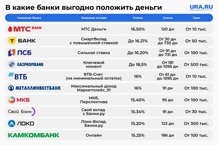 На этом фоне ряд банков анонсировал повышение доходности по краткосрочным вкладам: Московский кредитный банк предлагает до 19% годовых, Совкомбанк — до 18,5%, а МТС-Банк и банк «Дом.РФ» — до 16,5%. При этом ЦБ продолжает курс на снижение ключевой ставки, которая в октябре была уменьшена до 16,5% годовых. Подробнее о том, в каких банках выгоднее сейчас размещать свои средства — в материале URA.RU.