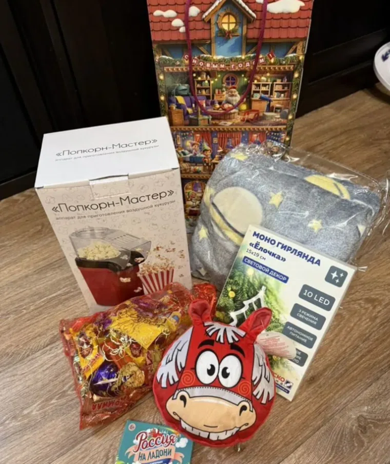 Подарок от «Лукойла» обойдется в 3300 рублей: в наличии два комплекта. Внутри — машинка для приготовления попкорна, подушка-игрушка с маской для сна, светящийся плед, карточная игра, моногирлянда и сладости.