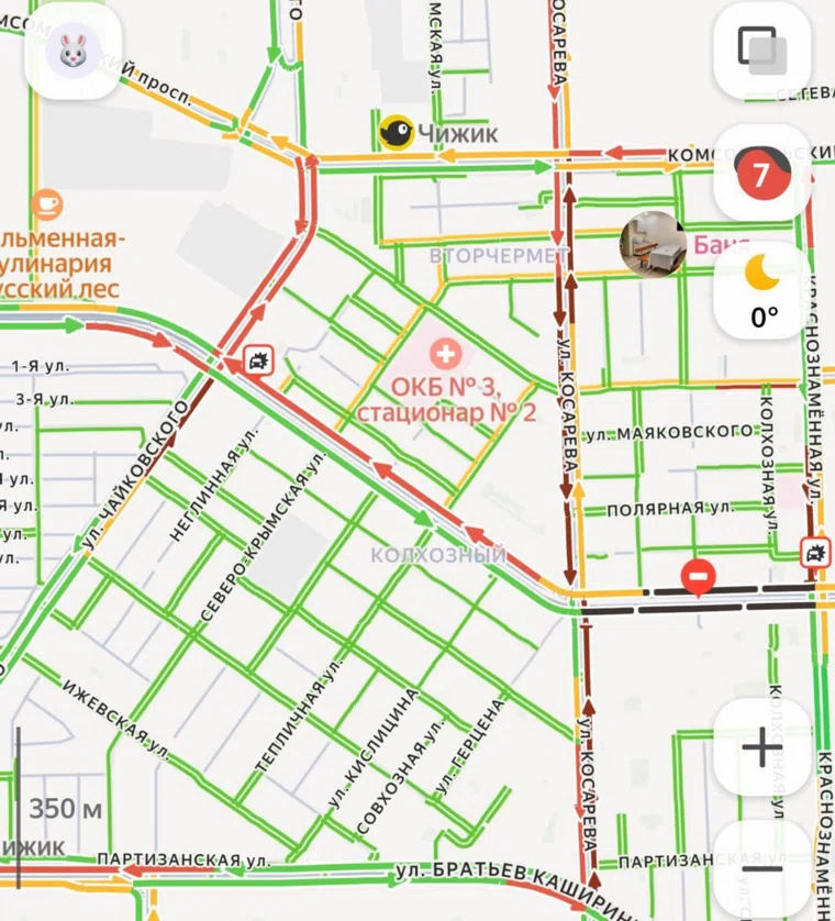 Огромная пробка образовалась по улице Косарева от Комсомольского проспекта до улицы Братьев Кашириных. Также движение крайне затруднено по Чайковского на подъезде к проспекту Победы и до Комсомольского проспекта. В целом обстановка с заторами в Челябинске оценена в семь баллов.