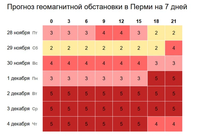 Согласно прогнозу, магнитная буря придет в Пермь вечером субботы 29 ноября. Пик геомагнитных возмущений придется на 2-4 декабря. После этого сила бури пойдет на спад и под конец декады она прекратится.