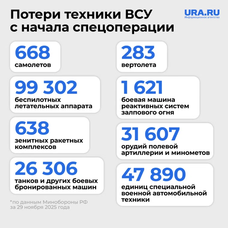 «Всего с начала проведения специальной военной операции уничтожены: 668 самолетов, 283 вертолета, 99 302 беспилотных летательных аппарата, 638 зенитных ракетных комплексов, 26 306 танков и других боевых бронированных машин, 1 621 боевая машина реактивных систем залпового огня, 31 607 орудий полевой артиллерии и минометов, 47 890 единиц специальной военной автомобильной техники», — сообщили в ведомстве. Данные актуальны в настоящий момент.