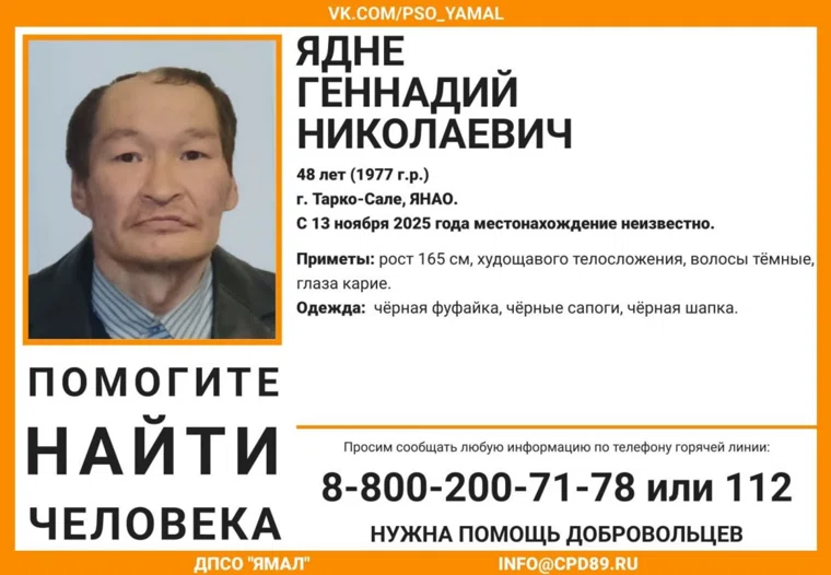 «Внимание! Помогите найти человека! Пропал Ядне Геннадий Николаевич, 48 лет, Тарко-Сале, Ямал. С 13 ноября 2025 года его местонахождение неизвестно», — сообщается в telegram-канале поисковиков.