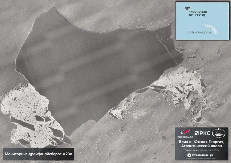 Спутник дистанционного зондирования Земли «Кондор-ФКА» сделал снимок расколовшегося айсберга А23а, дрейфующего в Атлантическом океане. Космический мониторинг позволяет отслеживать дальнейшую динамику и состояние одного из крупнейших айсбергов в мире.