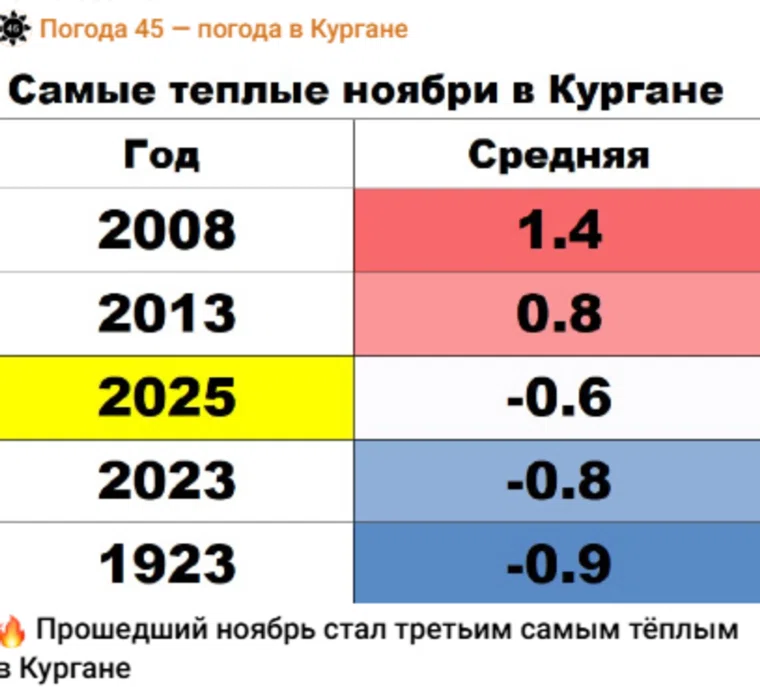 Ноябрь 2025 года в Кургане стал третьим самым теплым за весь период метеорологических наблюдений. Об этом сообщает telegram-канал «Погода 45».