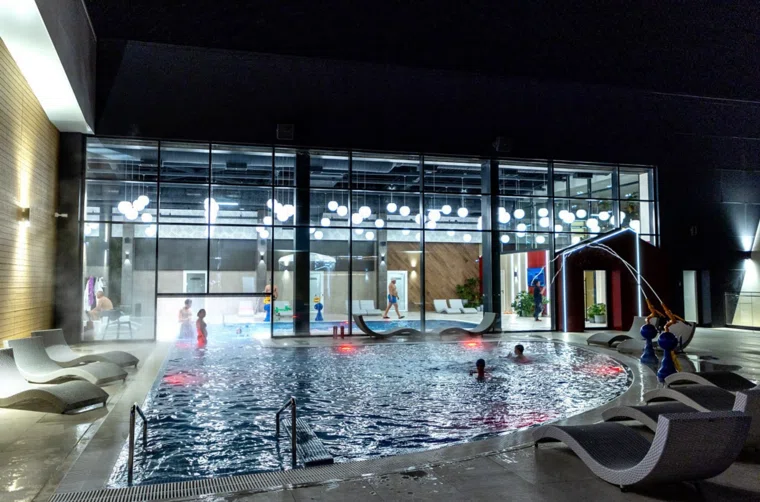 Термальный комплекс соединен отапливаемым переходом со спа-отелем, в котором предусмотрен 41 номер различной категории — от стандартных до бизнес-класса и апартаментов. Это позволяет гостям попадать в бассейны и сауны, не выходя на улицу.