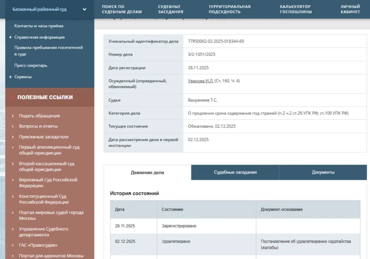 «Уварова И.Л. (ст. 160 ч.4). Категория дела — о продлении срока содержания под стражей. Постановление об удовлетворении жалобы», — информирует картотека Басманного районного суда города Москвы.