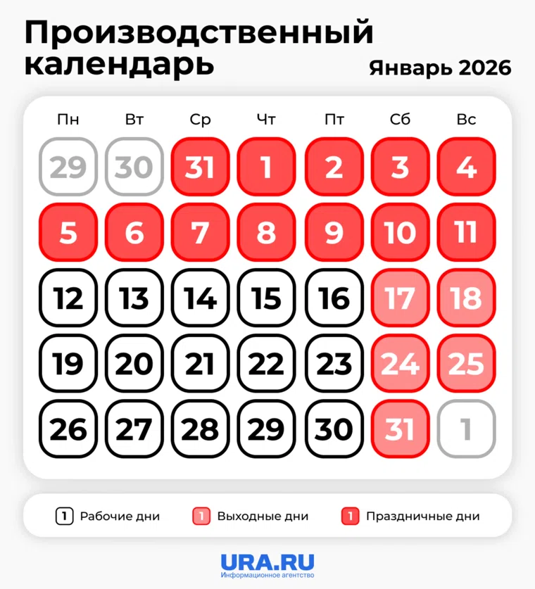 Январь 2026 года станет самым коротким рабочим месяцем в году. Всего в месяце 31 календарный день, из которых только 15 являются рабочими, а 16 приходятся на выходные и праздники.