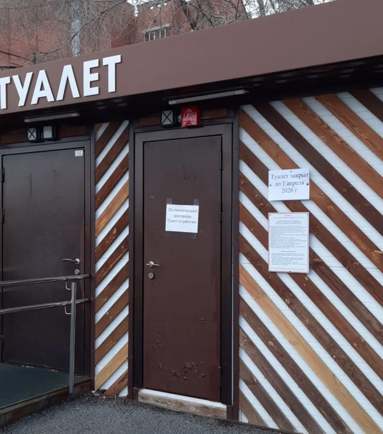 «Туалет закрыт до 1 апреля 2026 года. По техническим причинам он не работает», — указано на стене комплекса.