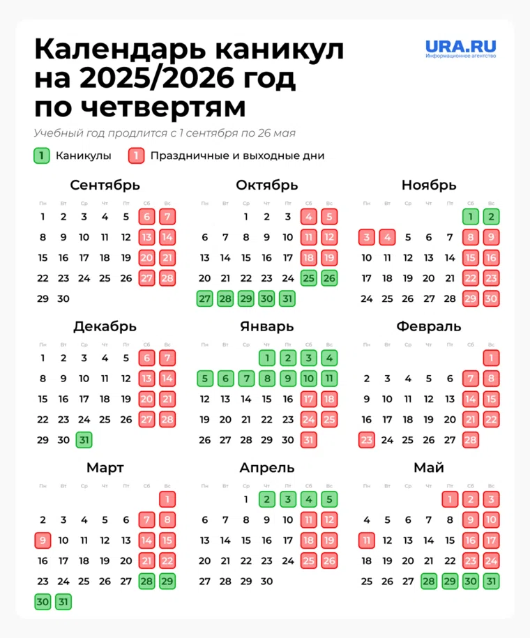 - Основные зимние каникулы — с 31 декабря 2025 года по 11 января 2026 года. Дети выходят в школу 12 января.